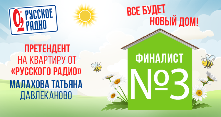 Финалистом № 3, претендентом на квартиру от «Русского Радио» акции «Всё будет Новый Дом» стала Татьяна Малахова из Давлеканово (республика Башкортостан).