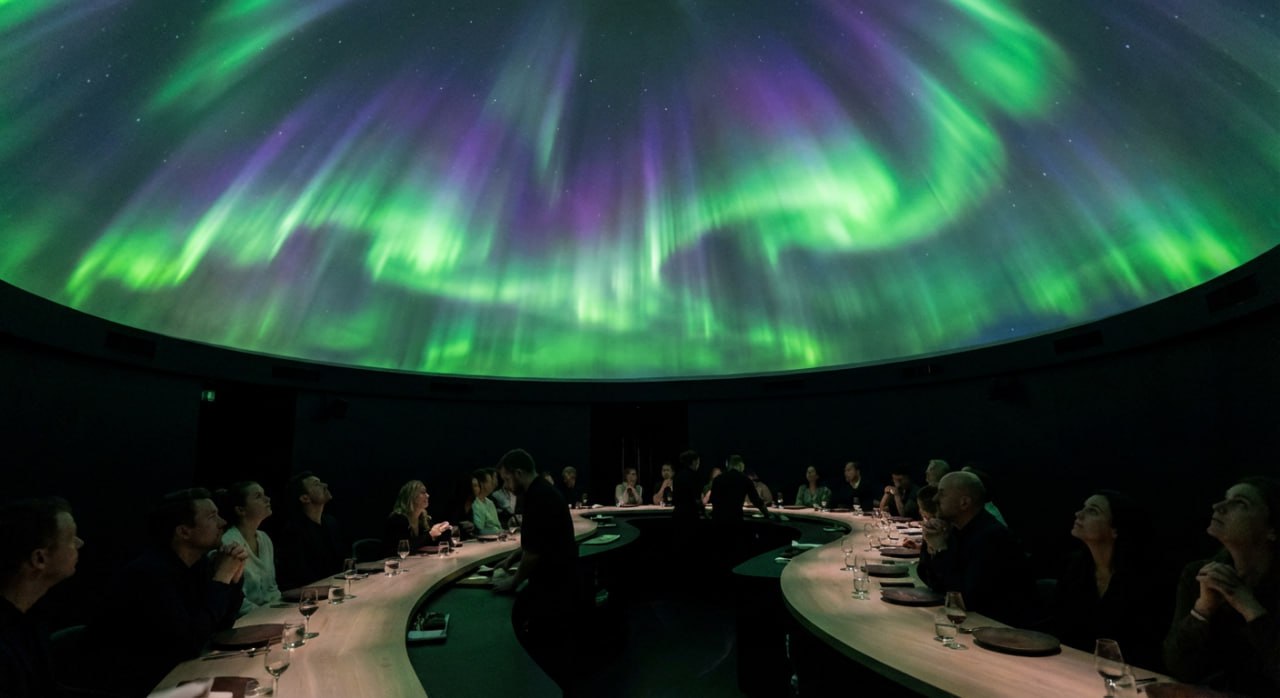 Главный зал накрыт гигантским куполом-планетарием, на который проецируются визуальные эффекты: от северного сияния до подводного мира. Шеф-повар Расмус Мунк называет свой стиль «холистической кухней».