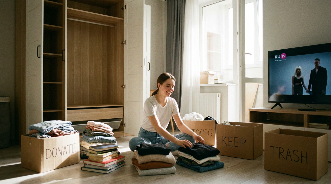 Метод «Четырех коробок». Раздели все вещи на четыре категории: «Оставить», «Продать/Отдать», «Выбросить» и «Переместить». Будь честным с собой!
