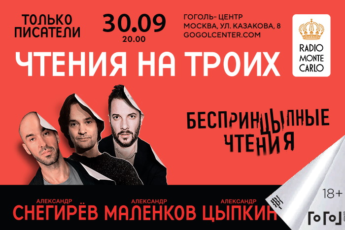30 сентября на малой сцене Гоголь-Центра впервые в новом сезоне встретятся три писателя — Александра. Их появление на сцене всегда вызывает особый ажиотаж, так как резиденты не часто радуют своими выступлениями. Зрители услышат «новую литературу» в исполнении Снегирёва, Цыпкина и Маленкова в рамках проекта «БеспринцЫпные чтения». Со сцены прозвучат не только новые и полюбившиеся рассказы авторов, но и импровизация «Только писатели», которая мастерски дополнит программу.
